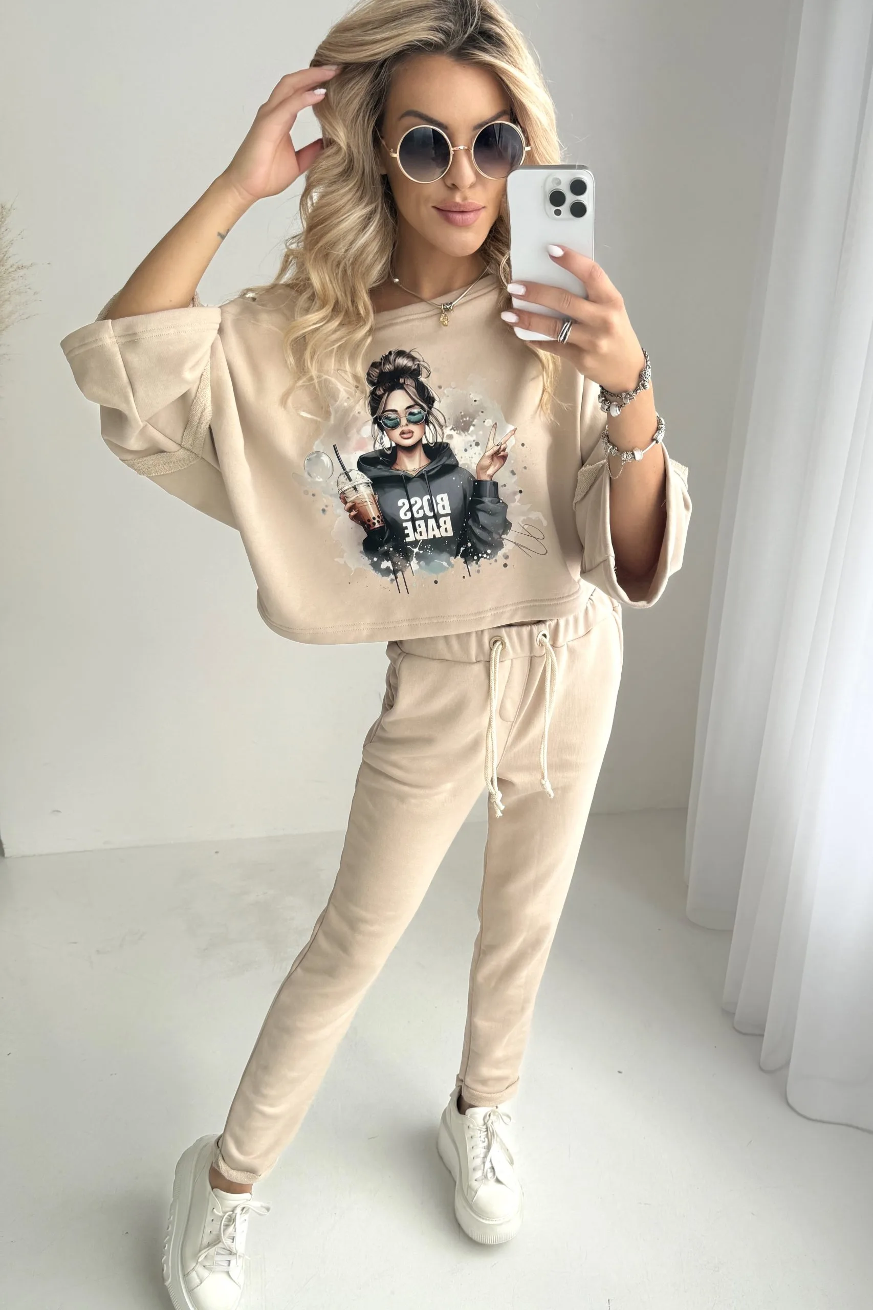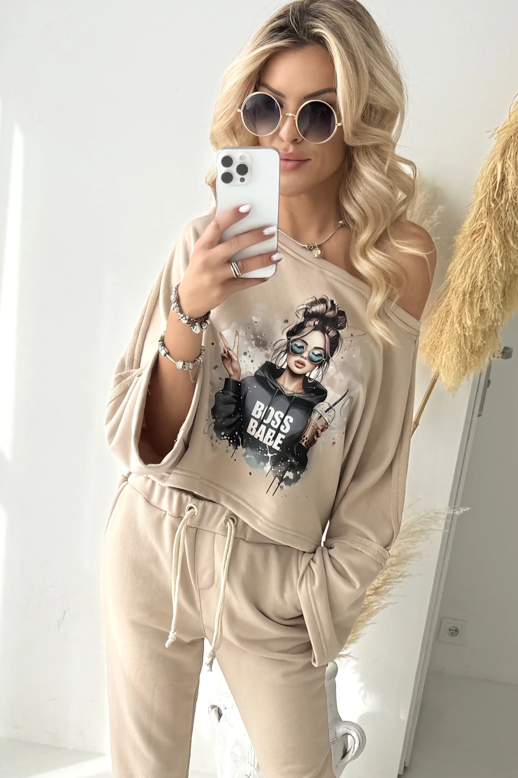Bluza z nadrukiem Enjoy Boss Babe w kolorze beżowym to wyjątkowa bluza z rękawem 3/4. Idealnie dopasowana do spodnie dresowych Calm. Jej krótszy fason idealnie wpasowuje się w panujące trendy. Jeśli lubisz sportowy, modny look i cenisz sobie wysokiej jakości wykonanie i materiału to model dla Ciebie. Proponujemy dobrać do nich spodnie dresowe Calm i stworzyć idealny komplet. Dopełnieniem może być kamizelka o krótkim kroju Joy lub dłuższa Glamour.