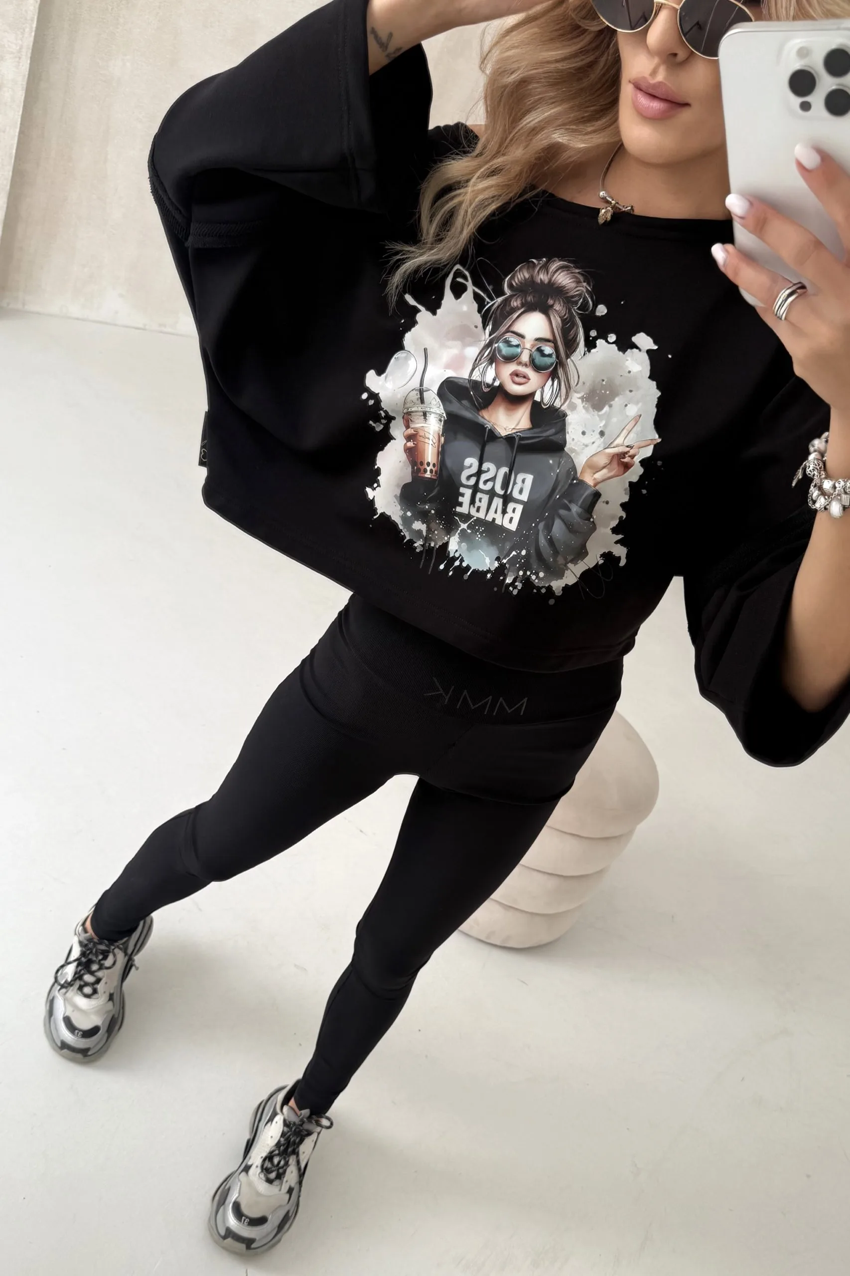 Bluza z nadrukiem Enjoy Boss Babe w kolorze czarnym to wyjątkowa bluza z rękawem 3/4. Idealnie dopasowana do spodnie dresowych Calm. Jej krótszy fason idealnie wpasowuje się w panujące trendy. Jeśli lubisz sportowy, modny look i cenisz sobie wysokiej jakości wykonanie i materiału to model dla Ciebie. Proponujemy dobrać do nich spodnie dresowe Calm i stworzyć idealny komplet. Dopełnieniem może być kamizelka o krótkim kroju Joy lub dłuższa Glamour.
