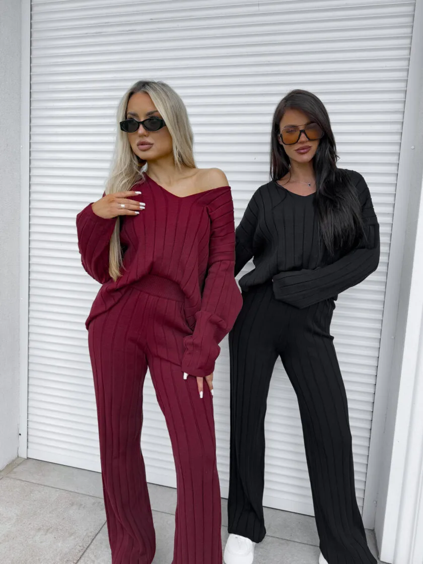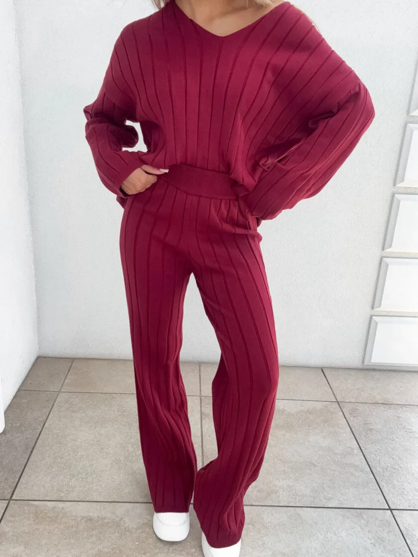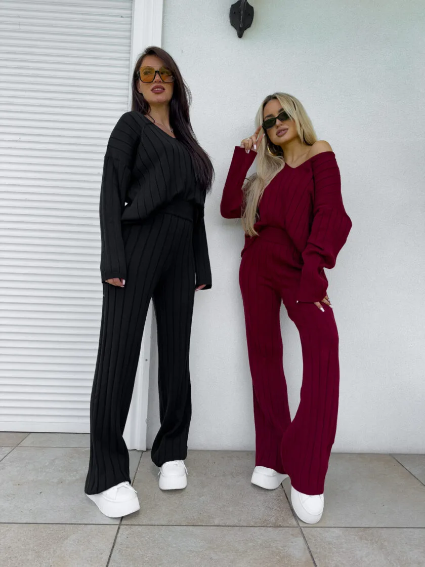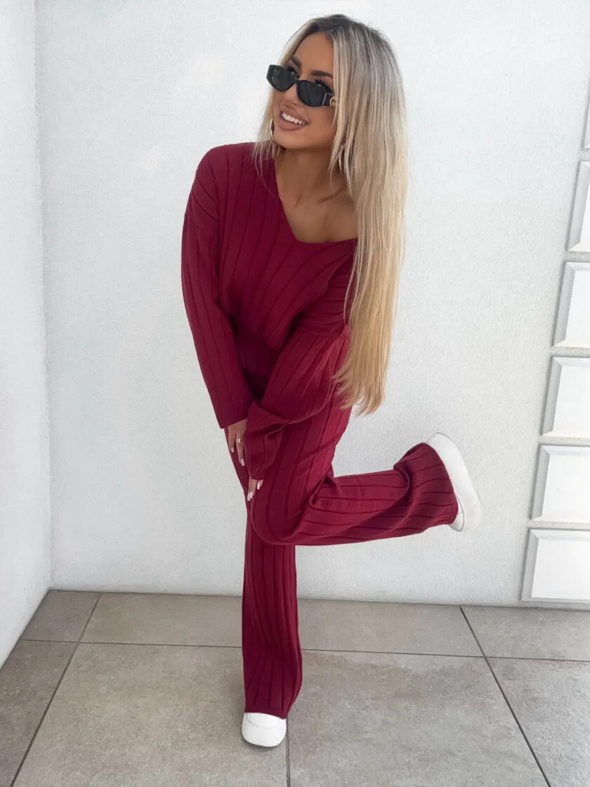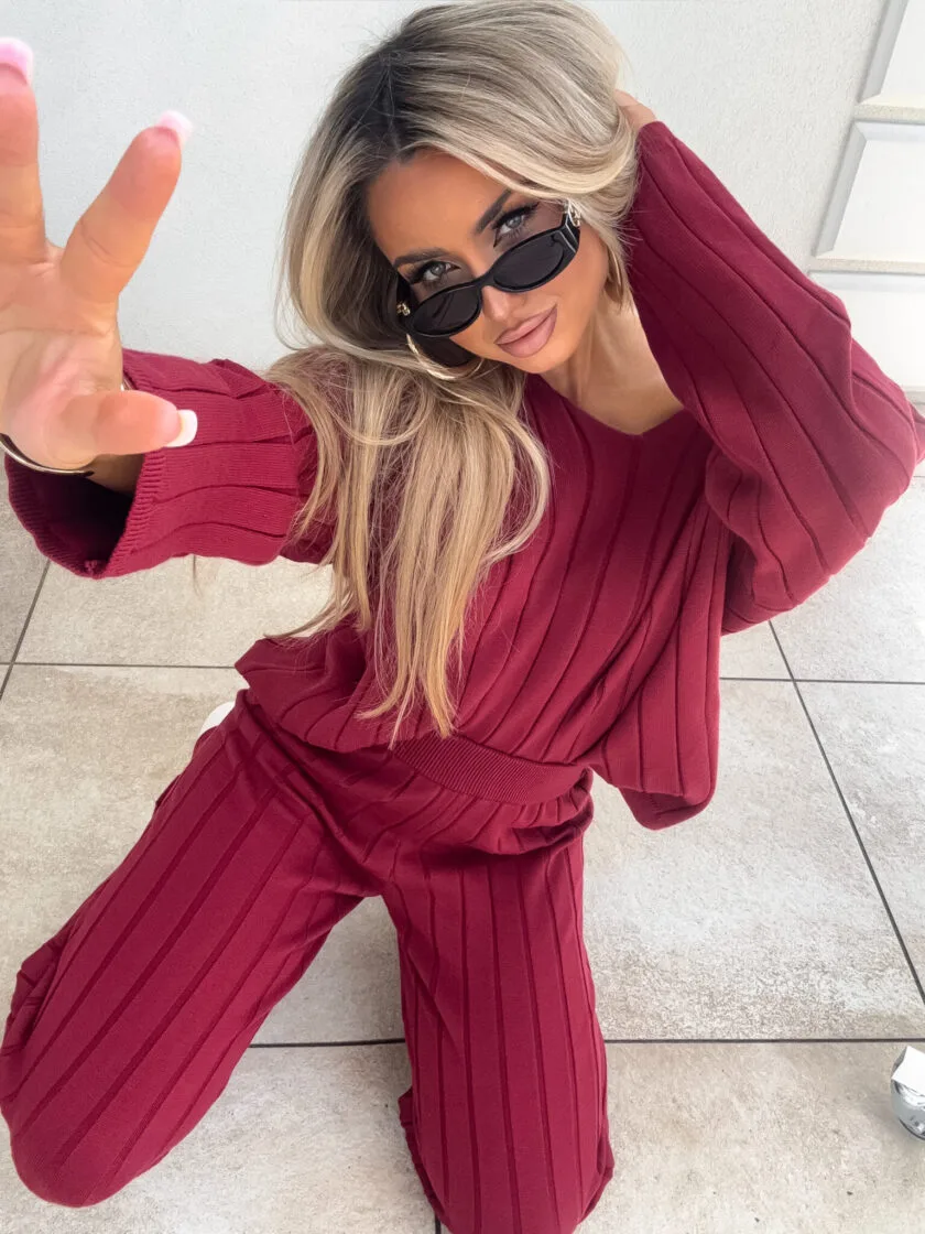 Komplet dzianinowy bordowy Candice to komplet składający się z oversize’owego swetra z długimi rękawami oraz spodni z wysokim stanem, uszytych z tej samej, przyjemnej w dotyku dzianiny. Sweter zakładany przez głowę, z dekoltem w serek, zdobią ozdobne pionowe przeszycia, które optycznie wydłużają sylwetkę i dodają całości subtelnej elegancji. Szerokie nogawki spodni oraz ich pionowy wzór doskonale współgrają z górą, tworząc spójną, harmonijną stylizację idealną zarówno na co dzień, jak i na bardziej casualowe wyjścia.